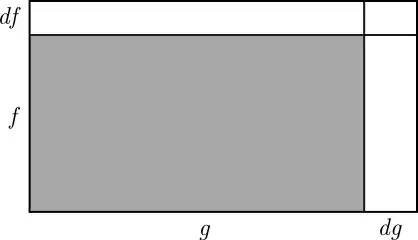 A slightly more difficult problem is to differentiate the product of two functions of Think of and as the vertical and horizontal sides of a rectangle of area As increases by the product increases by the sum of the areas of the three white rectangles in this diagram: