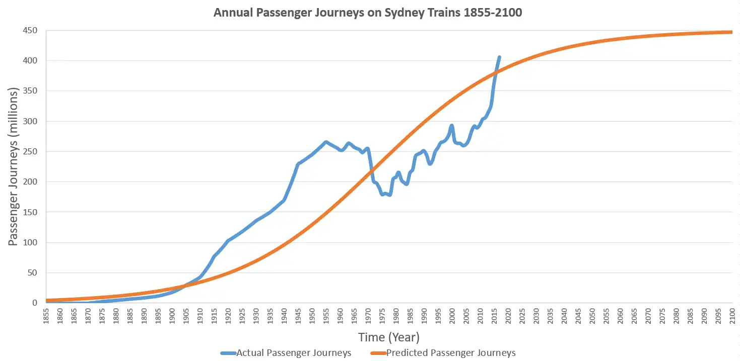 This Wikibook page provides a Qualitative and Quantitative assessment of Sydney Trains. It also incorporates the life-cycle analysis of Sydney Trains during its birthing, growth and development, maturity and the regeneration of growth phases. Eventually, a three-parameter logistic function and the S-Curve model provides a prediction based on the annual number of passenger journeys made on the Sydney Trains network.