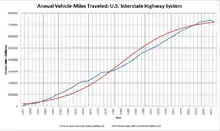 An analysis of the annual vehicle-miles traveled on the Interstate Highway System shows that it follows this pattern of development. Fitting the S-Curve requires an initial single variable linear regression to determine the b-value coefficient used in the logistic function of the S-Curve. The regression is of the form: Y=bX+c; where Y=LN(Vehicle-miles/(K-Vehicle-miles)), and X=Year K is the maximum extent of the technology, in this case estimated to be 750,000 vehicle-miles Once b is found, it can be used to determine the inflection point (t0=Intercept/-b), and the estimated extent of the technology using the S-Curve. The function is of the form: S(t)=K/[1+exp(-b(t-t0)], where t=time, t0=inflection point, and K=saturation point[4]