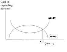A demand curve for a typical good is downward sloping, the more it costs, the less that will be consumed. However, the demand for a network good rises with the number of members of the network (Economides 1996). Each user of the network creates a positive externality for other users. Thus, networks exhibit a seemingly upward sloping demand curve, self-limiting at saturation, with perfectly inelastic demand.