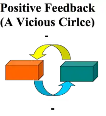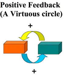However, many elements of the transportation system do not necessarily generate an equilibrium. Take the case where an increase in A begets an increase in B. An increase in B begets an increase in A. An example where A an increase in Traffic Demand generates more Gas Tax Revenue (B) more Gas Tax Revenue generates more Road Building, which in turn increases traffic demand. (This example assumes the gas tax generates more demand from the resultant road building than costs in sensitivity of demand to the price, i.e. the investment is worthwhile). This is dubbed a positive feedback system, and in some contexts a "Virtuous Circle", where the "virtue" is a value judgment that depends on your perspective.