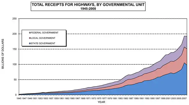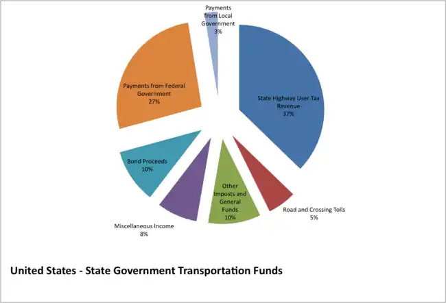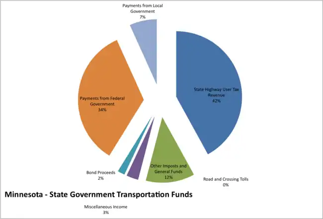 The state of Minnesota spent $2.36 billion on highways in 2008. The largest source of these revenues (42 percent) was state-level highway user taxes. As described in the previous section, the HUTDF collects revenues at the state level from a set of three taxes on motor fuel, vehicle sales and vehicle registration. By constitutional provision, 62 percent of these revenues are directed to state highway construction and maintenance, with the remainder distributed as aid to counties and cities. The second largest source of state government transportation funds, accounting for about one-third of all funds is federal highway aid. These revenues are collected from federal excise taxes on gasoline and other motor fuels, then distributed back to the states by formula. The third largest source of state funds falls under the category "Other Imposts and General Funds", accounting for about 12 percent of revenues. In the case of Minnesota, this relates to other state-level charges that are not listed under the heading of state highway user taxes. The State of Minnesota did not appropriate any general funds for transportation in 2008. Local government payments also accounted for a small share of revenues. These revenues are due to a cost participation policy followed by the state's department of transportation in which local governments are asked to contribute toward the cost of some cooperative construction projects engaged in by state and local units of government, and where some mutual benefit is recognized between both parties. An example might be a project that provided access to an interstate highway in a newly-urbanizing location.