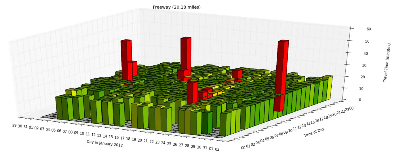 The 3-D graphs below show travel times by day and by hour for each corridor. Visually, one can see the better reliability of the inter-regional corridor over the urban. Blank areas represent points where real-time data did not exist along the entire corridor.