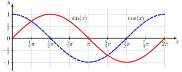 Different Phase has a different phase from . The phase difference happens to be 90°, because . If two waves are 180° out of phase then where one is positive the other has the same value only negative. is 180° out of phase with |