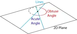 An angle is formed when two lines intersect; the point of intersection is called the vertex. We can think of an angle as the wedge-shaped space between the lines where they meet. Note that if both lines are extended through the meeing point, there are in fact four angles.