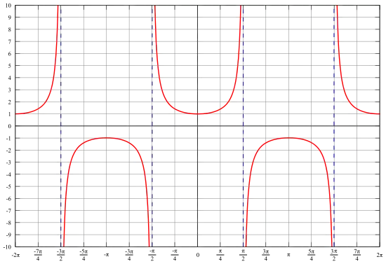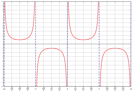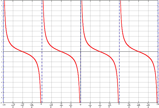 Notice that for certain values of , the tangent, cotangent, secant, and cosecant functions are undefined. This is because these functions are defined as , , , and , respectively. Since an expression is undefined if it contains division by 0, the functions are therefore undefined at angle measures where the denominator (the sine or cosine of , depending on the trigonometric function) is equal to 0. For example, the tangent function for 90º ( radians) is equivalent to , or , which is an undefined value.