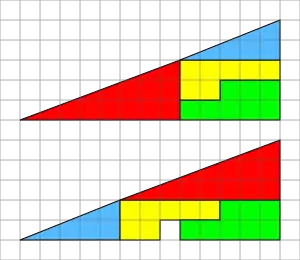 - Exercise: A Puzzle Triangle Triangle puzzle (invented by Paul Curry). This is getting across the importance of rigour in a fun way. Students who do work out what is going on will have a deeper sense of why you need to be careful in a proof and justify every step. It is not enough that two things 'look' the same. Students who don't work out the explanation themselves will still have had practice at calculating area and using Pythagoras. Later when we've taught cosine we suggest they go back and calculate the angles, so they get a second chance. We've made this exercise easier by having talked about slopes in an earlier exercise, with the roadsigns, and even had the same close ratios in those slopes.