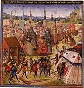 The responses to plague can be seen in the records left by survivors -- one third of the population of Europe died in repeated waves of disease -- and in the subsequent changes in society. Airplanes and satellites show the foundations of plague-era towns which were emptied by the disease. In just one square mile of pre-plague Europe there are reports of there being 50,000 people.[2] In large cities, families would flee or lock themselves away, trying to keep themselves from death. Other families were locked in by city authorities. This is the beginning of the modern system of quarantine.[3] Some branches of the family would not be among those so helped. The Black Death seemed erratic, sometimes taking people deemed good and pious, sometimes not. One priest or church prelate might die, and another survive. And a living priest might give no aid to other survivors. Some critiques of the Church which had become spread through most of Europe date from this era.