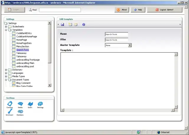 In the 'Settings' pane on the left hand side of the Umbraco GUI click on the plus icon to the left of the 'Templates' folder to expand the list of templates. Locate and click on the 'Search Form' template that you created in the previous step of this example.
