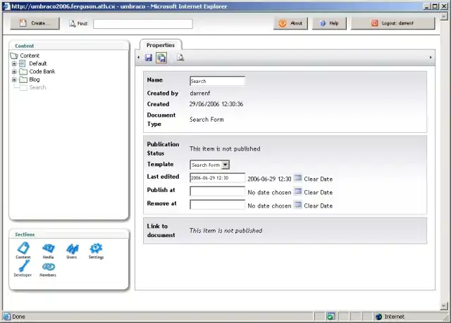 We are starting to get somewhere now. You will see that the Search node has appeared in the 'Content' pane on the left hand side of the Umbraco GUI. You will see that it is greyed out, so click on the 'Save and publish' icon (a globe and a floppy disk combined).