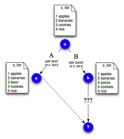 Consider the previous darcs hackathon example, where as usual, Arjan decides that the shopping list needs some beer. In this scenario, Ganesh decides that you can't live on apples and cookies alone and records a patch adding "pasta" to the s_list file. Now he wants to know what Arjan is up to, and so pulls the beer patch into his repository, but oh no! Arjan and Ganesh's patches conflict! How should darcs behave here?