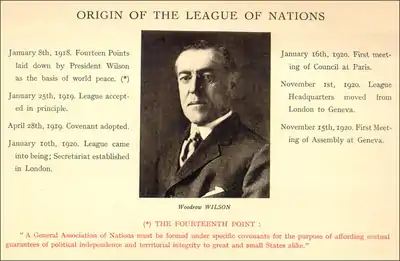 The League of Nations was an international organization founded as a result of the Treaty of Versailles in 1919–1920. The League's goals included disarmament, preventing war through collective security, settling disputes between countries through negotiation, diplomacy and improving global welfare. The diplomatic philosophy behind the League represented a fundamental shift in thought from the preceding hundred years.