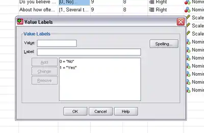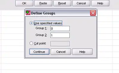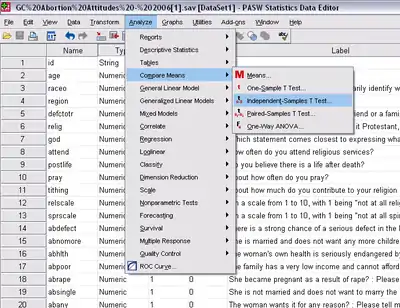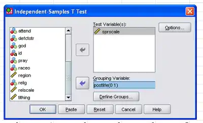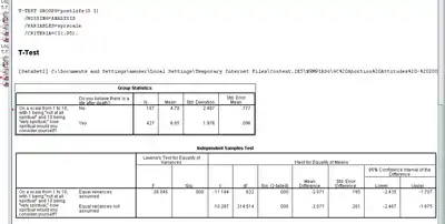 The above screenshot shows that not believing in an afterlife is labeled “0” and believing is labeled “1.” Once you know what your values are for believing in an afterlife, return to the t-test dialog. In the define groups window, add zero for “No” and one for “Yes”: