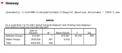 Once again, genetic counselors' religiosity varies by their abortion attitudes. However, regardless of whether or not the results show there is no significant relationship, what is important is that you can save time and energy by using syntax, particularly when you have a repetitive task you need to run many times. This chapter has only scratched the surface of syntax in SPSS; it can be used to run the entire program, avoiding the Data Editor window almost entirely. It should also be noted that other statistical software, like SAS and R, rely much more heavily on syntax. SPSS is known for being more user-friendly as it allows people to point and click to run tests.