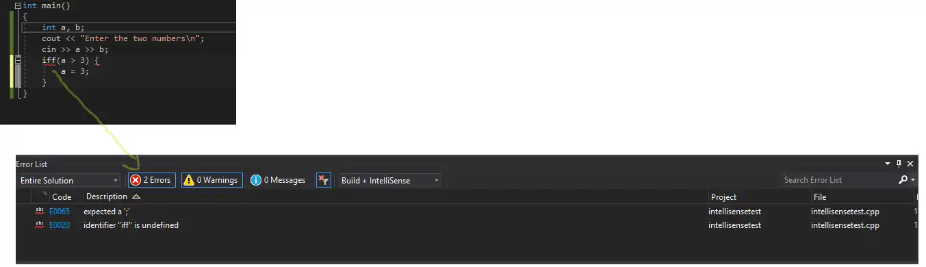Another very useful feature of Intellisense is the ability to detect errors before runtime. Some of them would be very trivial: