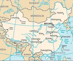 China is in eastern Asia. It has a long coastline in the eastern part of the country on the South China Sea (part of the Pacific Ocean). To the north, it borders Russia, Mongolia, and North Korea. To the west, Kazhakstan, Kyrgyzstan, Tajikistan, and Afghanistan. To the southwest, Pakistan, India, Nepal, and Bhutan, and to the southeast, Burma, Laos, and Vietnam.