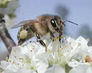 This bee is collecting pollen to create honey from a flower. The white lump on its hind leg is the pollen that it has collected.
