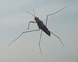 Water striders mate on the water’s surface. In some species, the males are territorial and defend small circles while waiting for females to drift by. Females are sometimes lured by vibrations made by a male tapping its legs on the water surface.