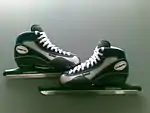 Hockey skates are used for playing the game of ice hockey. The boot is generally made of moulded plastic, leather (often synthetic), and ballistic nylon. The blade is curved at both ends.