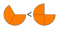 A fraction is two numbers, one on top of the other, with a line in the middle, like this: . The higher number is the numerator. It shows how many parts. The lower number is the denominator. It shows you the amount of parts that make one thing. If the denominator is big, the parts are small.