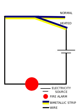 Bimetallic strips are used in daily life for heat detection, such as that in fire alarms and thermostats. A thermostat is a small gadget used in various household appliances to automatically switch off the appliance when it is overheating. In such applications, the bimetallic strip bends in order to complete or break a circuit. A circuit means the path on which electricity flows from its source and back. In thermostats, the circuit is broken so that the appliance it is used in can no longer operate. In fire alarms this is the opposite: the circuit is completed so that the fire bell can ring and everyone can escape.