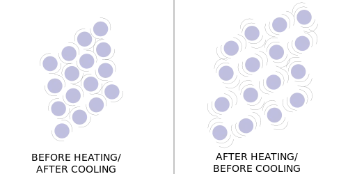 Do you remember, from the last chapter, that as heat made the particles move more vigorously, the volume of the air inside the balloon expanded and density of the air decreased? This is due to thermal expansion. When particles move more vigorously, they take up more space because they need more space for movement. See the diagram below.