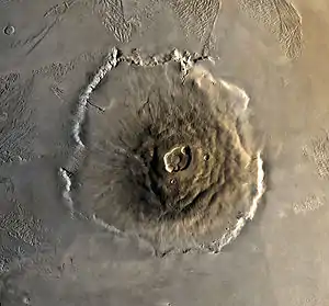 An overhead view of Olympus Mons, the highest mountain in the Solar System.