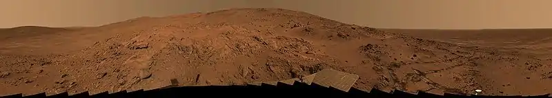 The surface of Mars is a lot like a desert on Earth; it is very dry and dusty, but it is also very cold. There are a lot of loose rocks and dunes of fine sand. Crater impacts mark the surface, but these are not as common as on the Moon. One of the craters is the huge Hellas Planitia. It is about half the size of the continental United States. The southern half of the planet has more craters than in the north. The south is also higher in elevation.