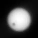 Deimos is one of the smallest moons in the solar system at only 12 km in diameter, or about 1/2 the diameter of Phobos. Surprisingly, however, Deimos was spotted and identified as a moon before Phobos, partly because of its greater distance from Mars, which meant that it was not so hidden in the glare of Mars' light. The surface area of Deimos is roughly the size of a medium-sized city on the Earth. It is also very irregular in shape, due to its small size.