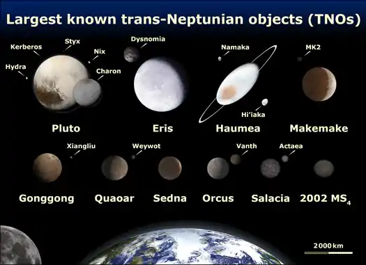 Beyond the orbit of Neptune is another big ring of things like the asteroids, called the Kuiper belt. Kuiper (said "KYE-per") was the last name of the person who first wrote about it. Most of the things in the Kuiper belt are hard to see through telescopes.