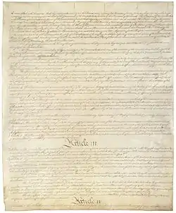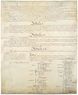 The United States Constitution is the supreme law of the United States of America. When nine states of the then thirteen states ratified the document it marked the creation of a union of sovereign states, and a federal government to operate that union. It replaced the weaker, less well-defined union that existed under the Articles of Confederation and took effect on March 4, 1789. The handwritten copy signed by the delegates to the Congress is on display in the National Archives in Washington, D.C. It is the second of the three Charters of Freedom along with the Declaration of Independence and the Bill of Rights.