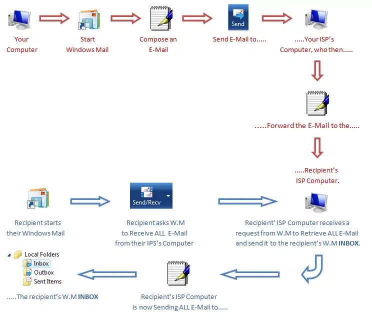 Assuming the verification/authorization all went well, when the recipient's ISP computer receives the email it goes through a similar verification/authorization process before putting the e-mail into the recipient's INBOX. So at this point, assuming all went well, your e-mail is now on your recipient's ISP computer waiting to be downloaded (received) by them. When your recipient wants to receive their e-mail they have to launch Windows Mail first, on their computer (shown above in blue, Recipient Starts Their Windows Mail), and then tell windows mail to RECEIVE ALL e-mail. What happens next is that their ISP's computer receives the RECEIVE ALL E-MAIL request from windows mail, verifies/authorizes the request (by checking their e-mail account details) and then sends (downloads) them their e-mails if all went well with the verification/authorization process. When they have received all of their e-mails they should have the e-mail you sent amongst them.