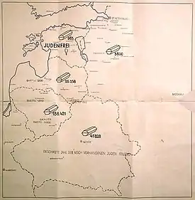 Map titled "Jewish Executions Carried Out by Einsatzgruppe A" from the December 1941 Jäger Report by the commander of a Nazi death squad. Marked "Secret Reich Matter," the map shows the number of Jews shot in the Baltic region, and reads at the bottom: "the estimated number of Jews still on hand is 128,000". Estonia is marked as judenfrei ("free of Jews").