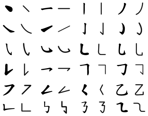 Chinese characters are made up of strokes, in the same way that English words are made up of letters. These strokes are easily learned but not easily mastered; Chinese Calligraphy is an art in Chinese culture. The image below shows all strokes that all Chinese characters are made up of, and how they look in two different writing media: the strokes on the left are written with an ink brush, and the strokes on the right are written with an ordinary ball-point pen.
