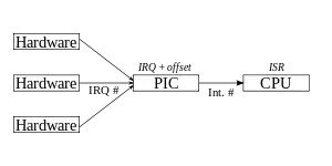 The function of the 8259A is actually relatively simple. Each PIC has 8 input lines, called Interrupt Requests (IRQ), numbered from 0 to 7. When one of these lines goes high, the PIC alerts the CPU and sends the appropriate interrupt number. This number is calculated by adding the IRQ number (0 to 7) to an internal "vector offset" value. The CPU uses this value to execute an appropriate Interrupt Service Routine. (For further information, see Advanced Interrupts).