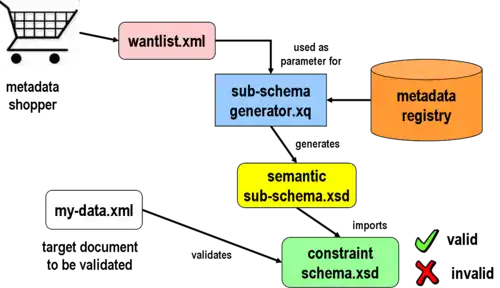 We will leverage many of the concepts of ISO/IEC 11179 metadata registry. We will use a single XQuery that takes in a wantlist and generates a semantic subschema from this registry. This assures that all leaf-level elements in a family of XML Schemas have consistent datatypes and precise semantic definitions that all refer back to the metadata registry. This automatic generation of structures from a central data model is known as model-driven design.