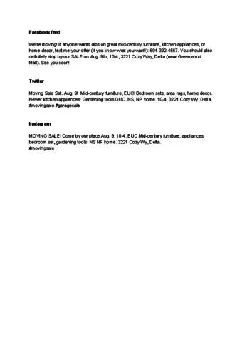 - Be sure to include the time, date, location, and some of the items you are selling. Ask if you can include pictures.