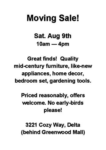 - Try saying something like, “We have to go. . .And our stuff does too! North End moving sale.”
