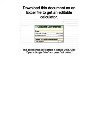 4Check your math. Multiply the principal, $10,000, by the annual percentage rate of .5 percent or .005 to calculate interest manually. The answer is $50.00. Multiply the daily interest amount of $.1370 by 365 days; the answer is also $50.00.