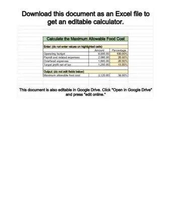 - To calculate your maximum allowable food cost, subtract that amount from 100%.