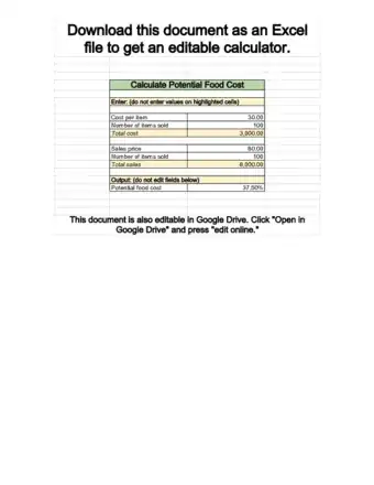 3Find out your potential food cost. To calculate your potential food cost, multiply the total cost by 100, then divide that number by your total sales. In our example, we would complete the following equation: ($3,000 X 100) ÷ $8,000 = 37.5. Our potential food cost is 37.5% of our budget.