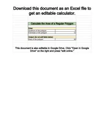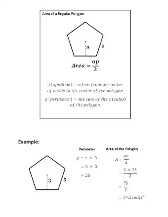 1Write down the formula for finding the area of a regular polygon. To find the area of a regular polygon, all you have to do is follow this simple formula: area = 1/2 x perimeter x apothem.[1] Here is what it means: