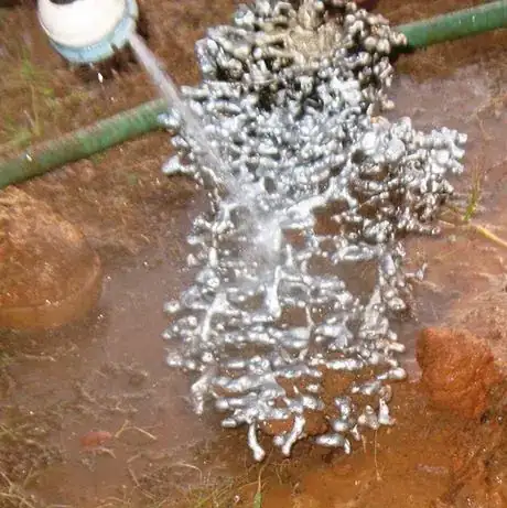 6Pour the molten aluminum carefully but quickly into the mound entrance. Continue pouring until the aluminum overflows the entrance so it is completely filled.