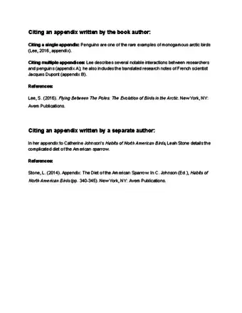 - If there are multiple appendices in the work, use the label provided in the work to point your readers to the correct appendix. For example: (Lane, 2017, Appendix A)