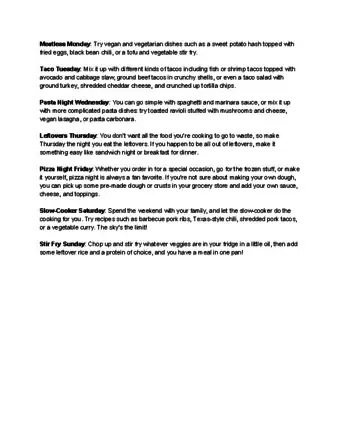 1Plan according to how much time you have to cook. Take into account how much time you have each day to cook. For instance, if you work 8 or more hours per day, you’re going to have less time available for preparing meals. Plan meals that are faster and easier to prepare.