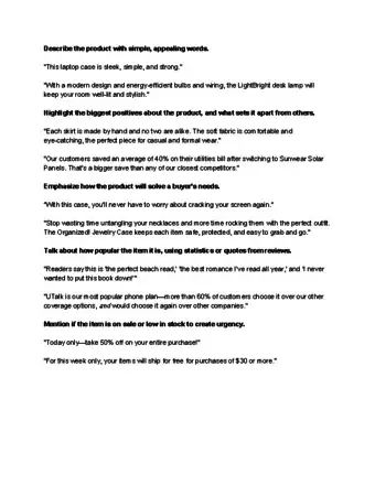 • For example, say, “This sweater is made of 100% cashmere wool. You will always feel warm and comfortable in it.” This informs potential buyers about the product as well as tells them what to expect from it.
