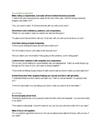 - Or you could say, “Therapy is an important part of recovery from an eating disorder. Let’s look into local therapists who have experience helping people with eating disorders and make an appointment for you.”