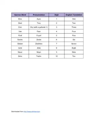 To count to 10 in German, start by saying the word "eins" for one and "zwei" for the number two. Say "drei" for the number three and be sure to pronounce it like "dry." Use the word "vier" for the number four and "fünf" for the number five. Say "sechs" for six and "sieben" for seven. Use the word "acht" for the word eight and "neun" for nine. Lastly, use the word "zehn" for 10! To learn more about German pronunciation, read on!