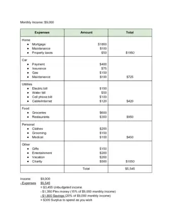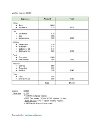 To create a budget, write down the income you bring in each month, then make a list of all of your monthly expenses. Include fixed payments, such as your mortgage or rent, flexible expenses like your groceries, and discretionary expenses like eating out or hobbies that are not necessary for your survival. If you have payments which are due periodically, such as quarterly insurance payments, calculate how much per month you need to set aside to pay those bills as well. For tips on adjusting your budget, keep reading!