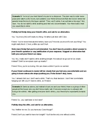 - For example, think about something to say if someone asks you to cheat, lie, steal, or take drugs. You might use a generic, “Naw, no thanks” or have something different for each situation.
